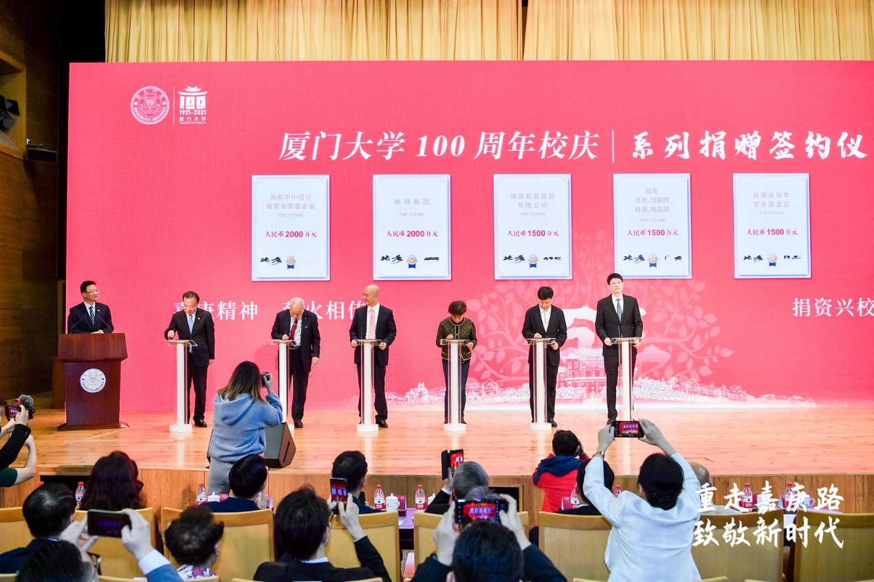4月5日上午,“重走嘉庚路,致敬新时代”主题展揭幕仪式暨100周年校庆系列捐赠签约活动在厦门大学科学艺术中心报告厅举行。厦门大学校党委书记张彦、副校长邱伟杰参加捐赠仪式,分别代表学校签约、接受爱心捐赠。