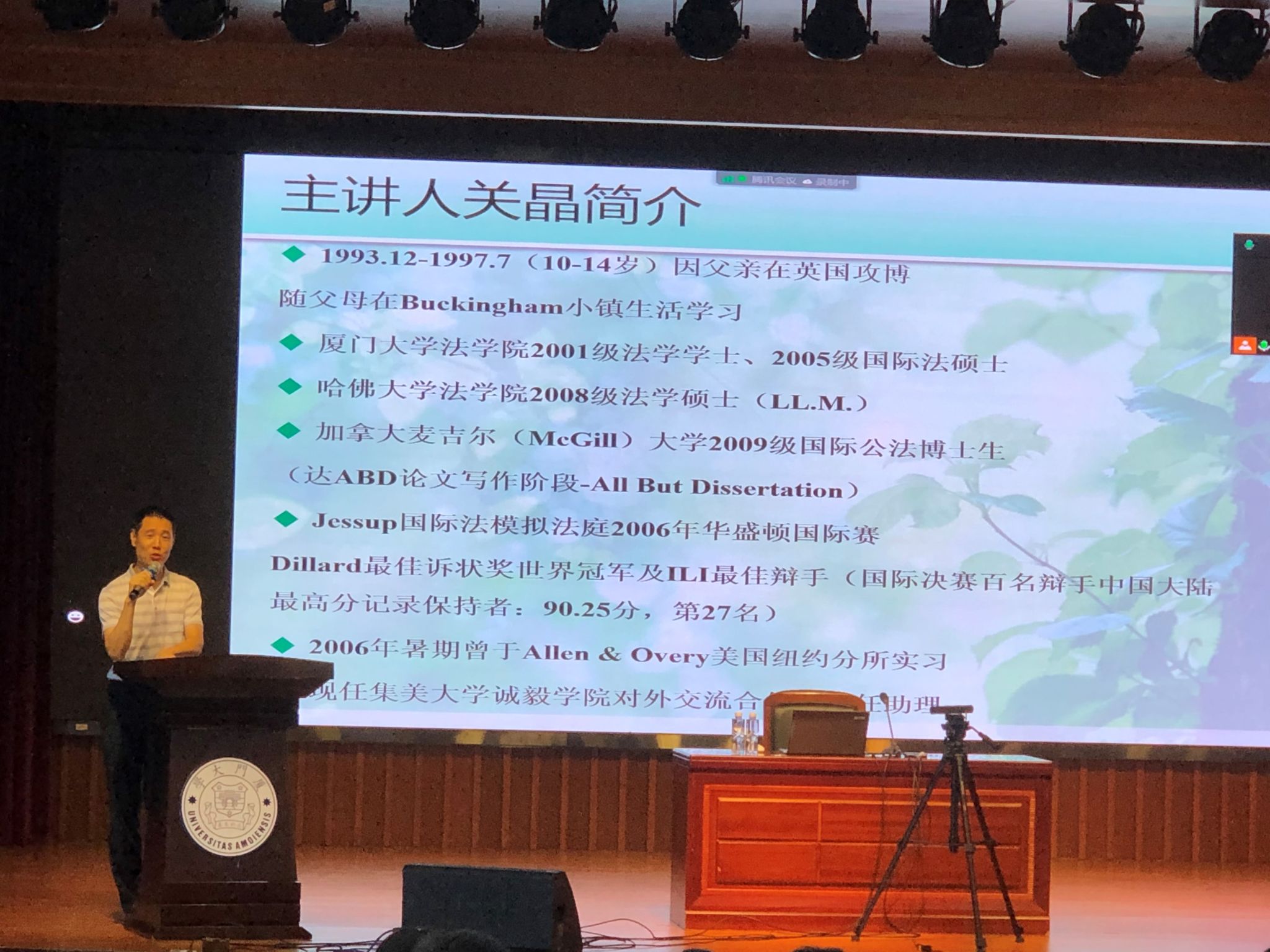 第三讲为“国际模拟法庭竞赛及法律人出国深造经验分享”,于2022年6月29日下午,由厦门大学法学院国际模拟法庭竞赛资深教练龚宇副教授主持,厦门大学国际法专业2005级硕士、集美大学诚毅学院对外交流合作部主任助理关晶校友莅临法学院模拟法庭主讲。关晶校友结合个人经历,分别从Jessup国际公法模拟法庭竞赛、Vis模拟国际商事仲裁辩论赛以及法律人出国深造经验这三个方面进行了主题汇报,并在汇报过程中以多样化的照片为同学们展示了丰富多彩的国际竞赛场景和留学生活,增进了同学们对国际模拟法庭竞赛和海外名校留学的进一步了解。