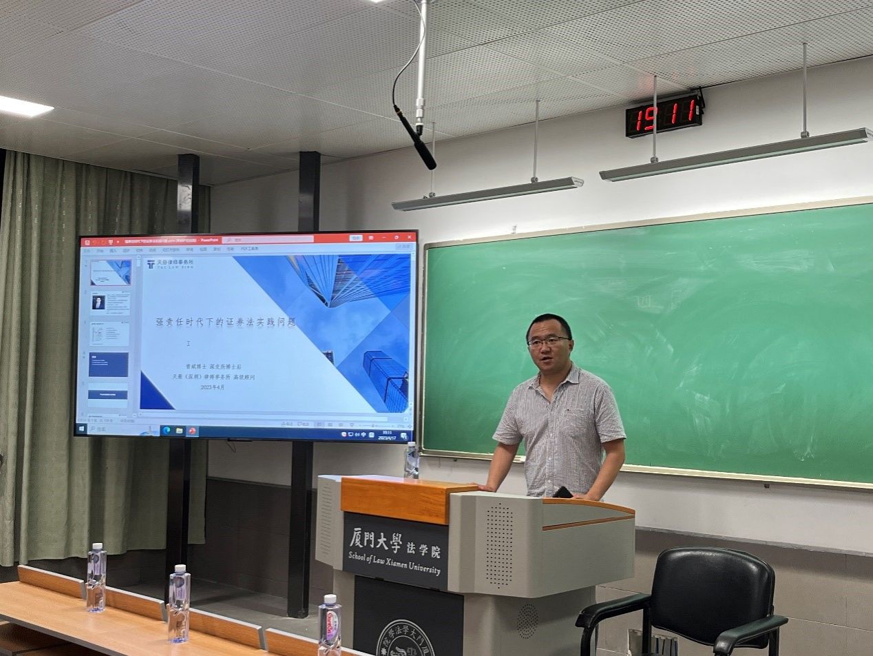2023年4月17日晚,由厦门大学法学院法与政治经济学研究中心主办的“法律与政治经济系列讲座”第二期在法学院A101教室顺利举行。受法与政治经济学研究中心主任毛海栋老师邀请,浙江天册(深圳)律师事务所高级顾问曾斌博士做了题为“强责任时代下的证券法实践问题”的讲座,法学院几十余位学生以及来自盈科厦门等律所的数位律师参加了本次讲座。