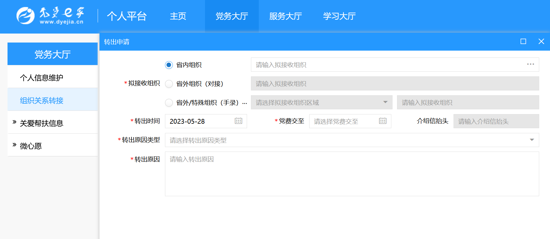 党员登录“党员e家”平台(www.dyejia.cn)→点击“登录”→登录个人平台→进入“党务大厅”→选择“组织关系接转”→点击“申请”→选择“省内组织”→填写拟接收党支部名称(厦门大学法学院2023级新生党支部)→填写“转出时间”→填写“党费交至”时间→填写“转出原因类型”→填写“转出原因”→点击“发起申请”。等待党支部和基层党委(党总支)逐级审批。如下图所示。