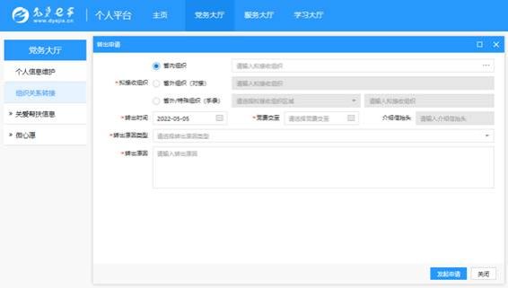 党员登录“党员e家”平台(www.dyejia.cn)→点击“登录”→登录个人平台→进入“党务大厅”→选择“组织关系接转”→点击“申请”→选择“省内组织”→填写拟接收党支部名称(厦门大学法学院2022级新生党支部)→填写“转出时间”→填写“党费交至”时间→填写“转出原因类型”→填写“转出原因”→点击“发起申请”。等待党支部和基层党委(党总支)逐级审批。如下图所示。
